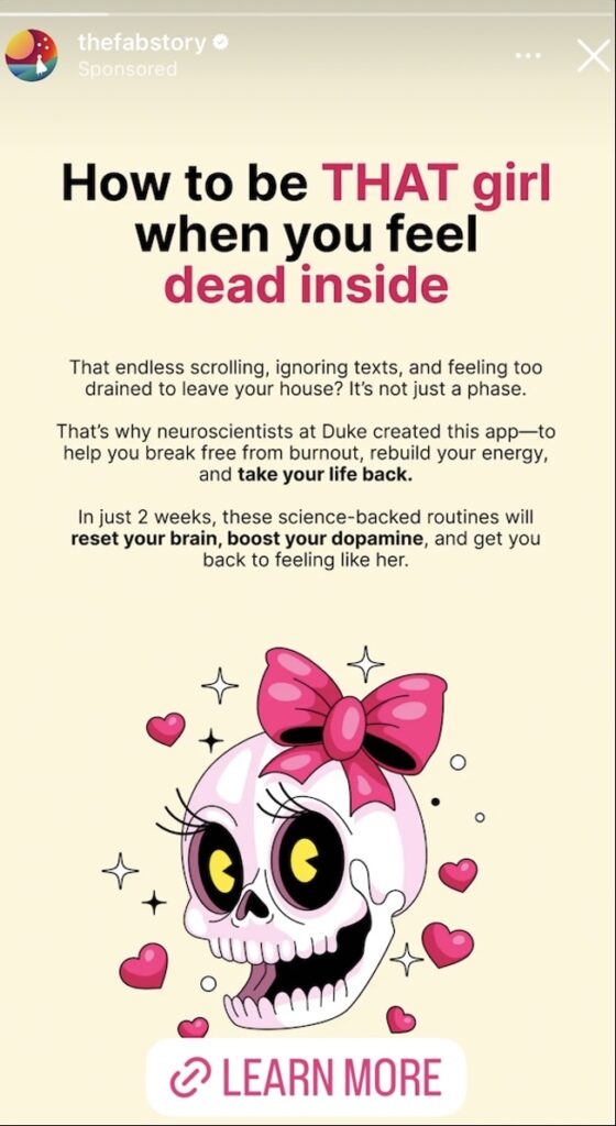 When I finally broke and decided to find out what @thefabstory was actually selling—retreats, spa-like inpatient programs, girlboss training camps?—I learned that Fabulous is a subscription-based cognitive behavioral therapy app that promises to help users build healthy habits and in turn achieve their life goals. Redditors argue it is an impossible-to-cancel service preying on the neurodivergent that “love-bombs you with crap.”