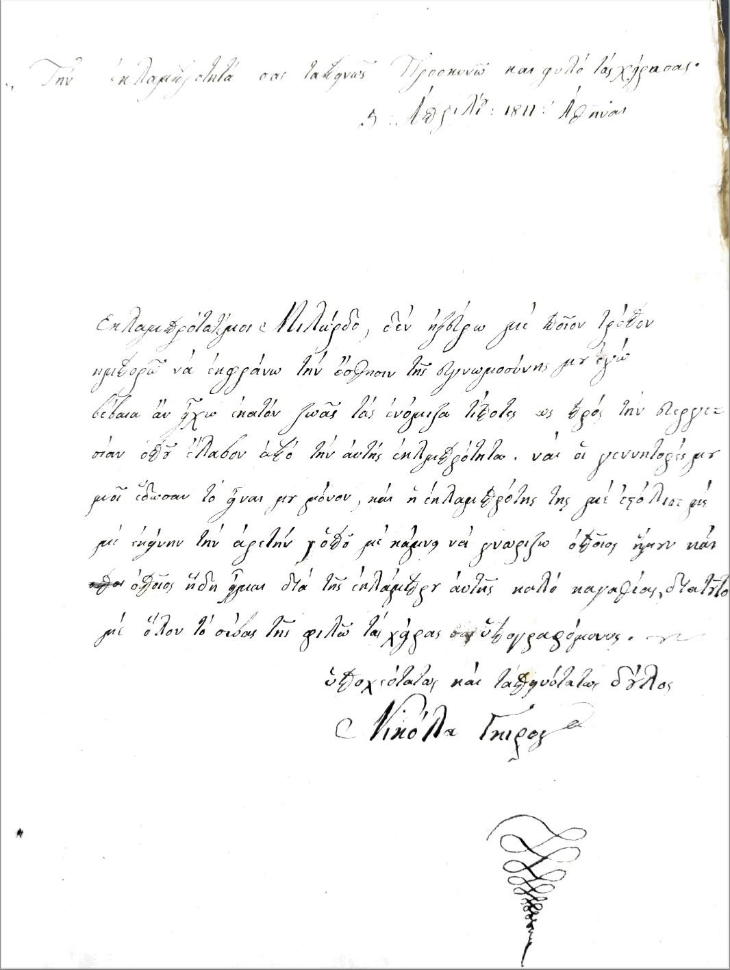 My master, Mr Demetrius, I send many greetings and kiss your eyes and ask God for your good health. Let me say that I have not yet received any letter from Athens and I do not know how they are, but as soon as I receive one I will send it to you at the first opportunity. Nor have we received anything from you, master, and we do not know how your journey was. I ask you to beseech my Lord to write often, and if my Lord does so that you, master, do so too, and write to me often. And if you ask after my health, very well. Send many greetings to Spyros. No more, and may God grant us happy meetings,