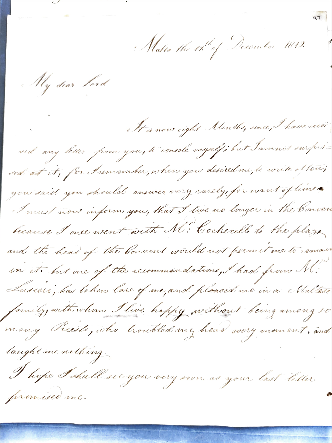 It is now eight Months, since I have received any letter from you, to console myself; but I am not surprised at it, for I remember, when you desired me, to write often, you said you should answer very rarely, for want of time. I must now inform you, that I live no longer in the Convent because I once went with Mr Cockerell to the play, and the head of the Convent would not permit me to remain in it, but one of the recommendations, I had from Mr Lusieri, has taken care of me, and placed me in a Maltese family, with whom I live happy, without being among so many Priests, who troubled my head every moment, and taught me nothing.