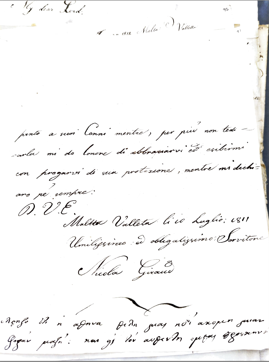 I have received your dear letter by the hands of the two Albanese of the Marquis of Sligo, written by your Writer Demetrius on the 6 of December 1811, so ordered by your Excellency in which he writes me that your Excellency had received two letters of mine and two from my Italian Master and that if my letters were written in English they would give you greater pleasure, but I remember very well that when you were in Malta, you told me not to write it until I could do it without mistakes, and for that reason, I did not write you in that Language then: but now that I can do it, I write you in English, and have also written you two other letters before this. He informs me, that your Excellency will come back to Malta in June, which gives me very great pleasure, and I shall begin now to pay more attention to my studies that when you come you will find me as you wish.